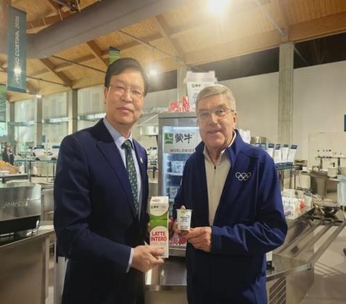 國(guó)際奧委會(huì)終身名譽(yù)主席巴赫(右)與蒙牛高級(jí)執(zhí)行總裁李鵬程(左)在米蘭奧運(yùn)村運(yùn)動(dòng)員食堂
