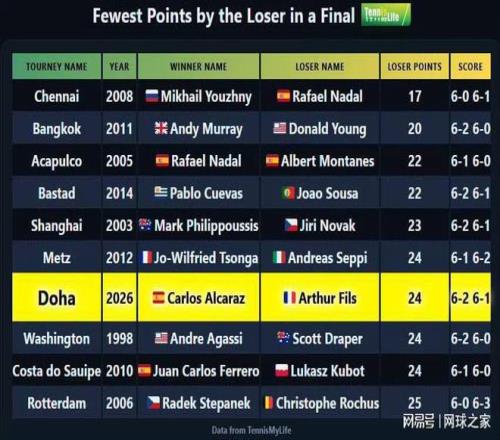 那么,自1990年ATP巡回賽建立以來,亞軍決賽總得分最少的排名榜上,菲斯的24分能排到第幾位呢?讓我們看看歷史榜單: