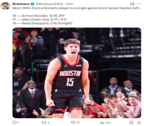 28+7三分創(chuàng)4紀錄哈登后首人!謝潑德先發(fā)又炸裂休媒卻炮轟火管