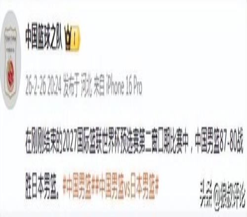 中國籃協(xié)官方社媒賽后更新社媒發(fā)文:在剛剛結束的2027國際籃聯(lián)世界杯預選賽第二窗口期比賽中,中國男籃87-80戰(zhàn)勝日本男籃。