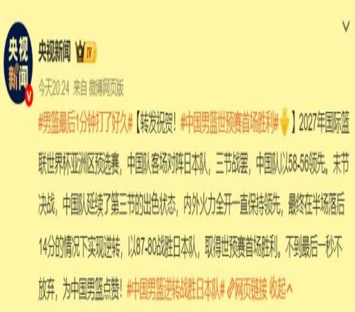一場(chǎng)14分大逆轉(zhuǎn)的關(guān)鍵勝利,不僅中國(guó)男籃全體隊(duì)員們都興奮不已,甚至有些隊(duì)員喜極而泣,而且人民日?qǐng)?bào)和央視新聞也都在第一時(shí)間發(fā)文,祝賀中國(guó)男籃得來(lái)不易的世預(yù)賽首勝,紛紛為這支不畏困難,無(wú)比頑強(qiáng)的隊(duì)伍點(diǎn)贊!這就叫排面啊!是不是?