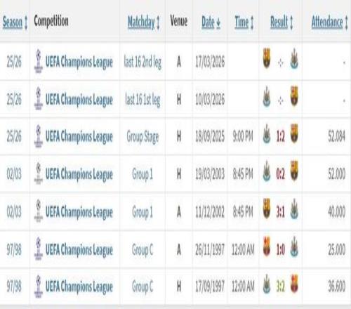 02-03雙方再次在小組賽相遇,巴薩主場(chǎng)3-1、客場(chǎng)2-0雙殺了紐卡,巴薩最終小組頭名出線,紐卡則小組第三出局,不過巴薩在16強(qiáng)中兩回合2-3遭到尤文淘汰。