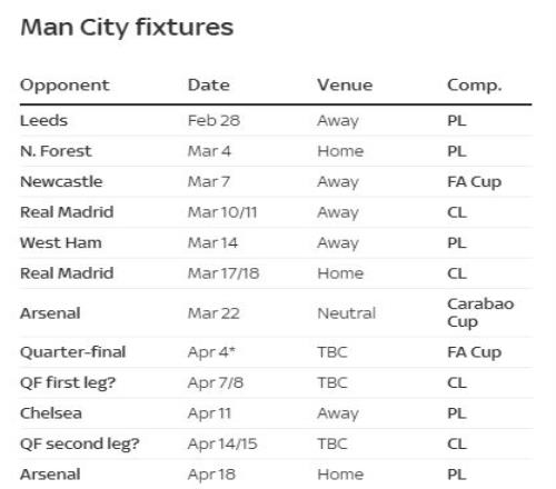 3月7日,曼城將客場(chǎng)對(duì)陣紐卡斯?fàn)?,隨后將在3月10日或11日做客伯納烏。3月14日,曼城客場(chǎng)對(duì)陣西漢姆。3月17日或18日,曼城將在主場(chǎng)對(duì)陣皇馬。3月22日,曼城將在聯(lián)賽杯決賽里對(duì)陣阿森納。