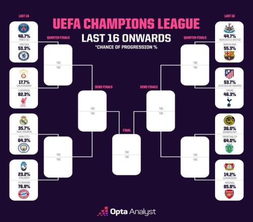 歐冠淘汰賽抽簽結(jié)果出爐后,知名數(shù)據(jù)機(jī)構(gòu)Opta預(yù)測(cè)了各隊(duì)晉級(jí)八強(qiáng)的概率。