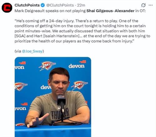 戴姆波特賽后也談到加時(shí)賽DNP亞歷山大:他剛剛傷愈歸隊(duì),他已經(jīng)休養(yǎng)了24天,他剛剛回來我們給了他登場(chǎng)時(shí)間限制,他與哈騰都是有登場(chǎng)時(shí)間限制的,我們一直優(yōu)先考慮球員的健康狀態(tài)。