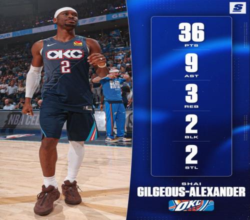 全場(chǎng)比賽33分46秒,亞歷山大29中12,三分3中0,罰球13中12,拿到36分9助攻3籃板2搶斷2蓋帽,命中率41.4%,真實(shí)命中率51.8%,正負(fù)值+16。亞歷山大完完全全的躺贏一場(chǎng),第四節(jié)不是卡魯索兩個(gè)三分早已輸球,加時(shí)賽關(guān)鍵1斷1上籃幫助球隊(duì)拿下勝利。