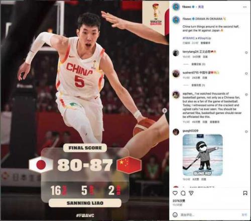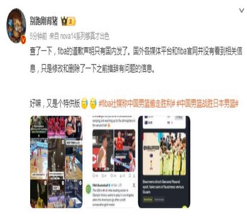 FIBA隨后修改爭議帖子,并將文案修改為“中國男籃下半場翻盤,擊敗日本男籃”,但最初并未公開道歉。