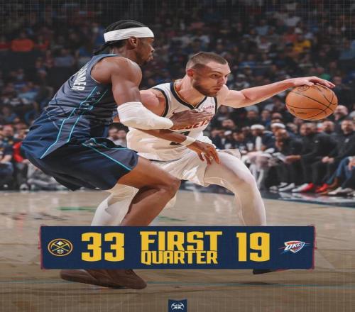 第一節(jié)打完,掘金33-19領先雷霆14分。約基奇單節(jié)6分9籃板3助攻,亞歷山大8分1助攻。場上摩擦不斷,多爾特搶籃板時拉拽約老師的球衣,阿隆-維金斯又跟約老師互相推搡。第二節(jié)初段,約老師在場下休息,雷霆一波流追到2分。
