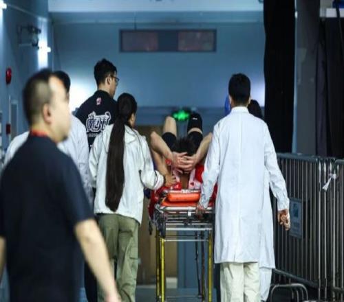 郭艾倫倒在地上,一邊捂著膝蓋,一邊流下眼淚,還用手拍擊地板,確實是很難受。此時廣州龍獅男籃的球員和教練都圍上來了,還叫了醫(yī)護人員上場。最終,郭艾倫被隊友抬上了擔(dān)架床,被醫(yī)護人員推出場,提前退賽。
