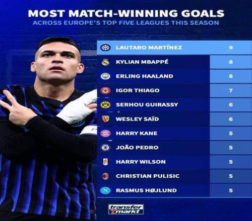 德國轉(zhuǎn)會市場盤點了本賽季五大聯(lián)賽打進制勝球球員情況,勞塔羅以9球居首,姆巴佩和哈蘭德以8球并列次席。以下為具體排名情況: