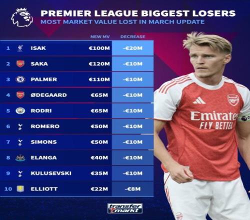 北京時間3月9日,德轉(zhuǎn)更新英超身價。其中伊薩克下跌2000萬歐來到1億歐元,薩卡、帕爾默、厄德高、羅德里各下跌1000萬歐。