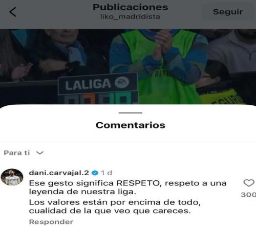 卡瓦哈爾在社媒上回復了一名指責他為塞爾塔傳奇鼓掌的用戶:“這個舉動代表尊重,是對我們聯(lián)賽傳奇的尊重。價值觀高于一切,這正是我看到你所缺乏的品質。”
